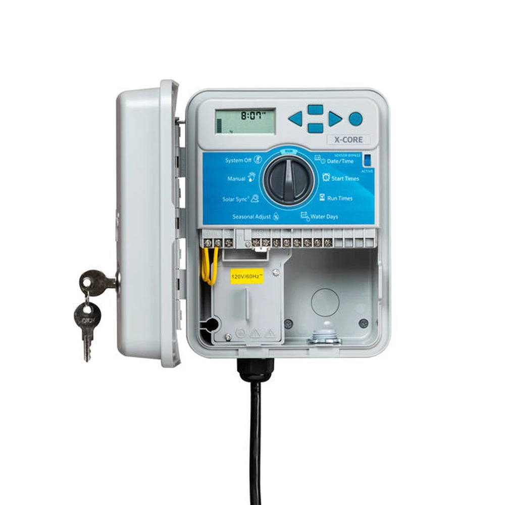 The X-Core Automatic Controller has a built in Solar Sync module which enables easy plug in of the Solar Sync Sensor converting it to a Smart Controller, using advanced water conservation technology and regulating irrigation runtimes based on locally measured weather.
