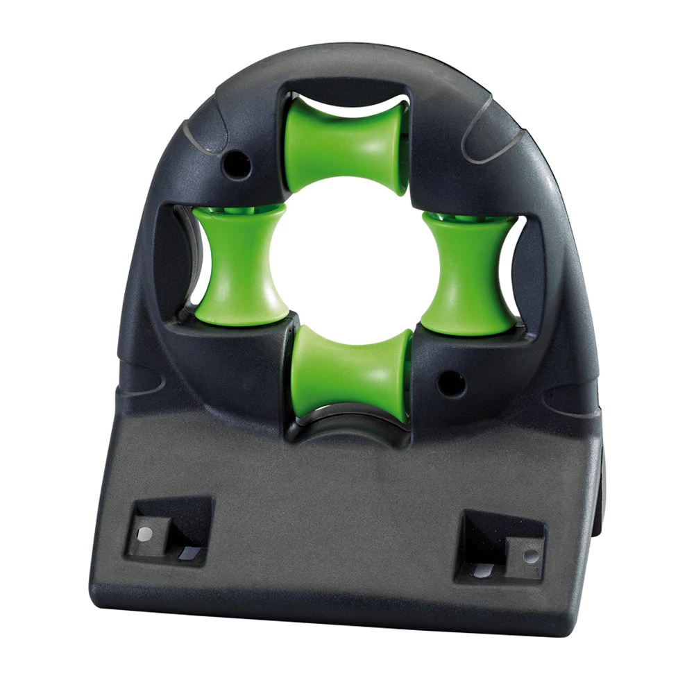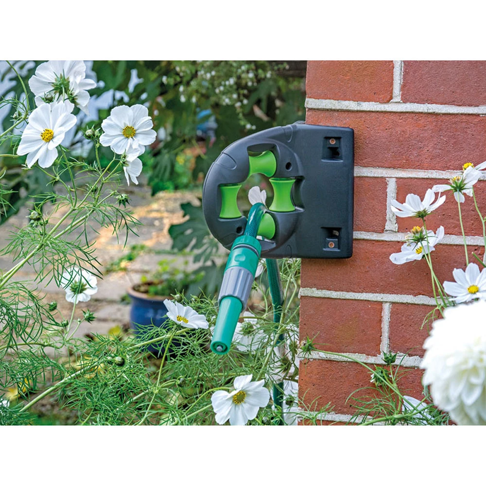 Plastic garden hose guide with rollers designed to help eliminate kinks and twists in garden hoses. Fitted with a zinc spike, which secures the hose guide into the ground.