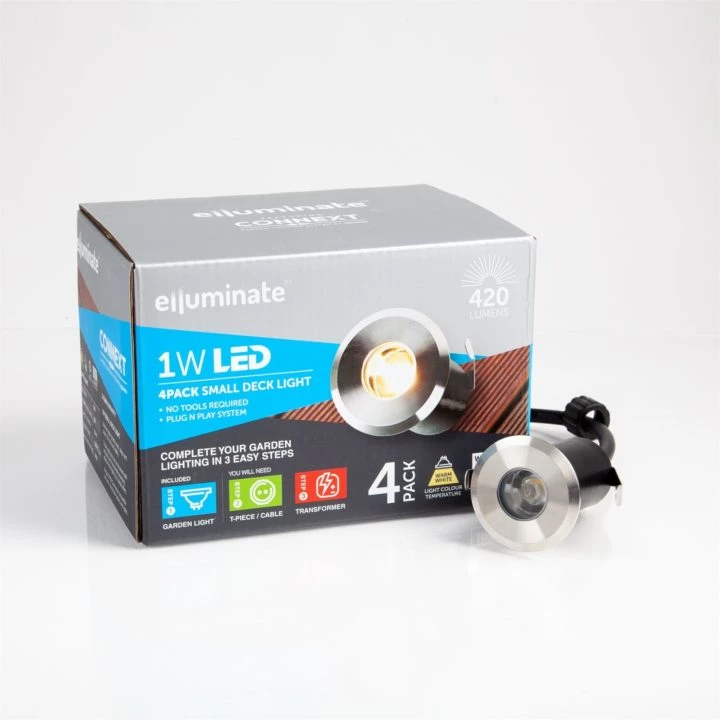 There’s nothing like spending an Aussie evening out on your back veranda bathed in the comforting, warm white glow of Elluminate deck lights. Sold as a set of 4, and also as a kit, these lights are incredibly easy to install. If you want to extend to more than 4 lights, the transformers can take up to 15 lights which you can easily add to from the Elluminate range. Comes with a 2 pin Elluminate plug and a 0.2m cable to connect up efficiently. Also attached to each light is a decking spring bracket to make the install effortless, either vertically or horizontally, allowing for effective foot lighting or an uplight effect.