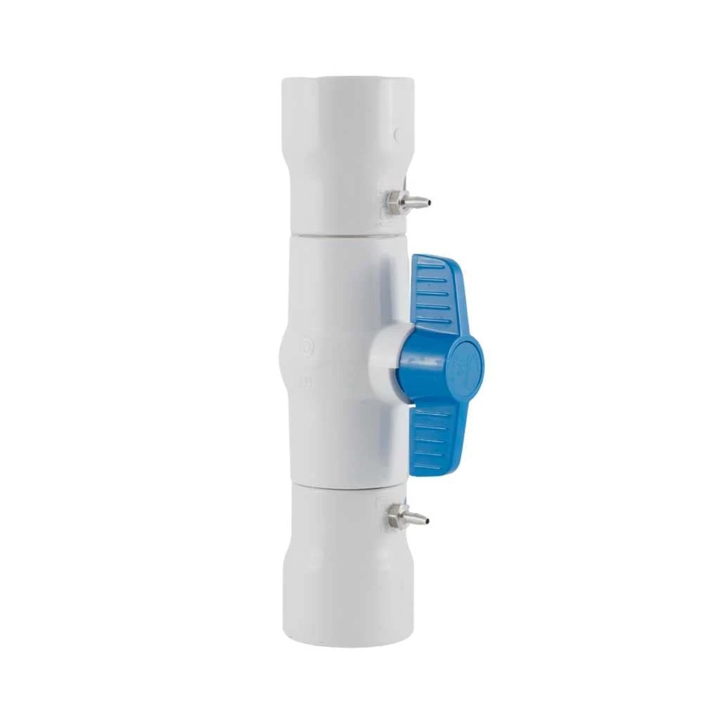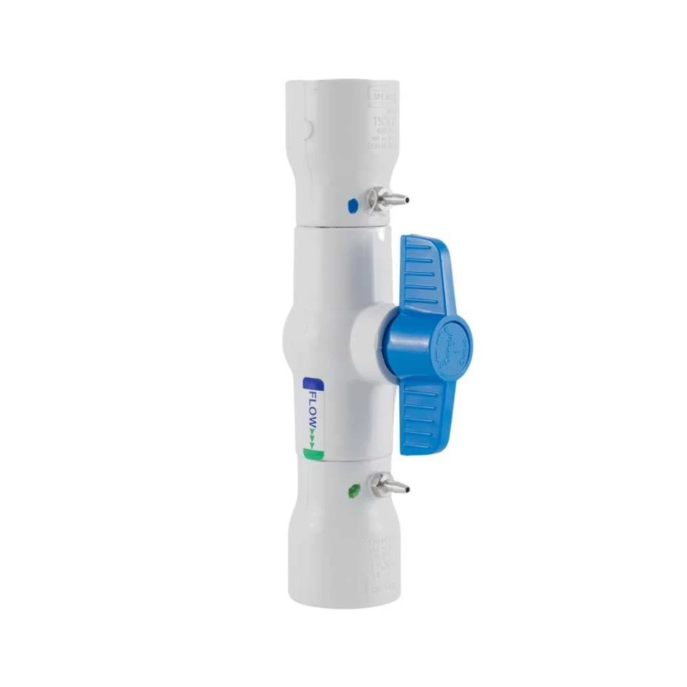 EZ-FLO Ball Valve Coupling connectors are socket x socket connections. They are PVC schedule 40 on both ends. Each end also has a 1/4 nylon barbed tubing connector protruding from the top. They are used to connect the EZ-FLO system to the irrigation flow line with the 1/4″ flexible tubing provided with the EZ-FLO system when the elevation of zone valves downstream from the EZ-FLO System installation point are at an elevation 10′ or more above the installation point. They provide the ability to adjust the differential pressure between the inlet and outlet connection to the irrigation system flow line and can ensure that even the heaviest organic fertilizers and supplements can be pulled from the tank.