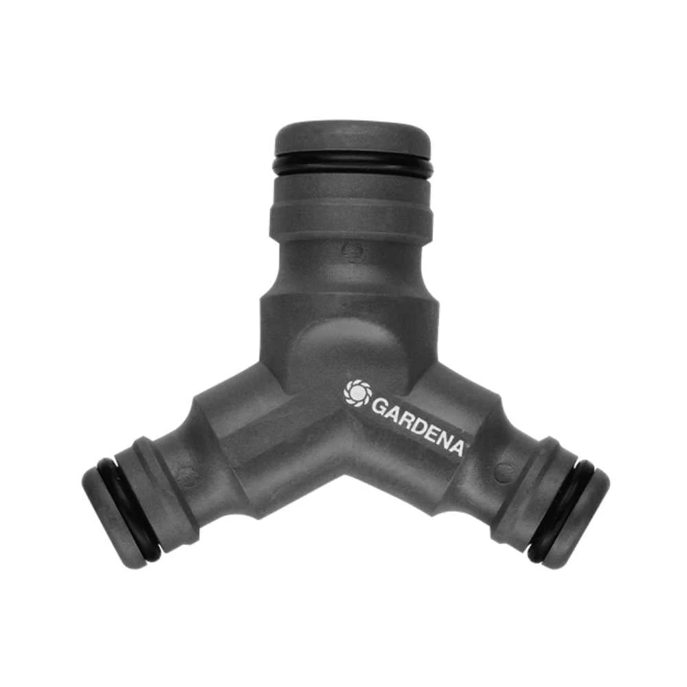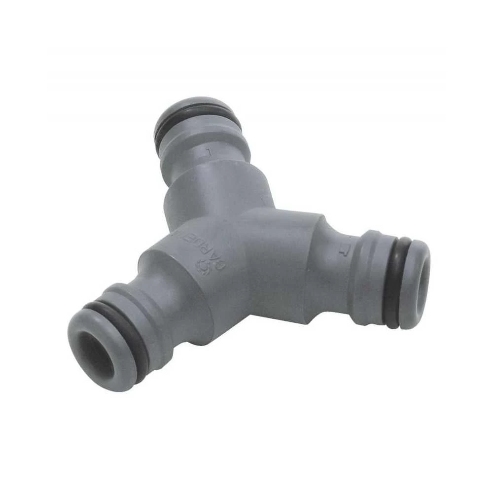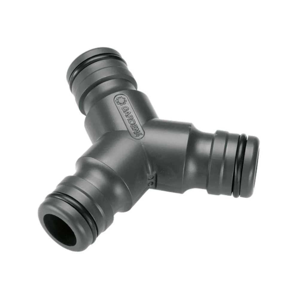 Three way joiner allows simultaneous watering at two separate locations, using the one tap.