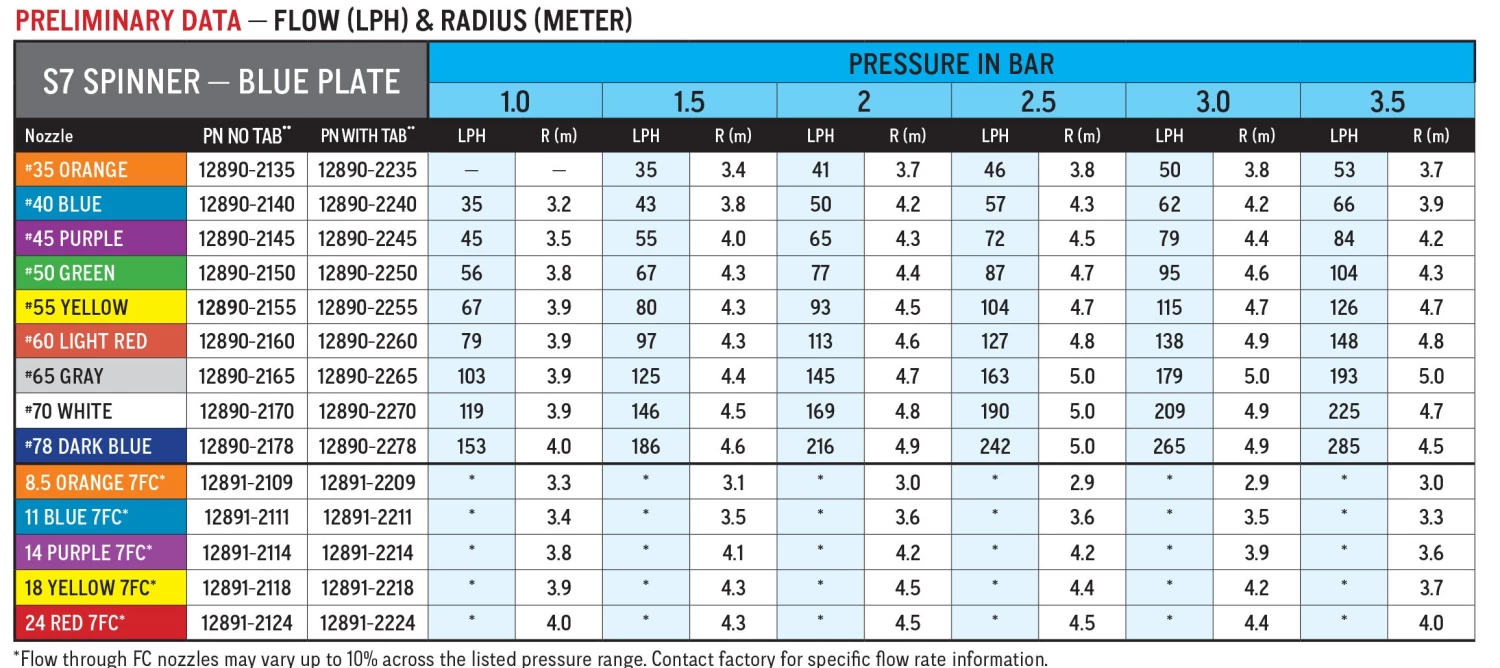 The S7 Blue plate covers the entire nozzle range. It is available with or without the radius limiting tab for starting trees, which can be broken off for full radius when trees mature.