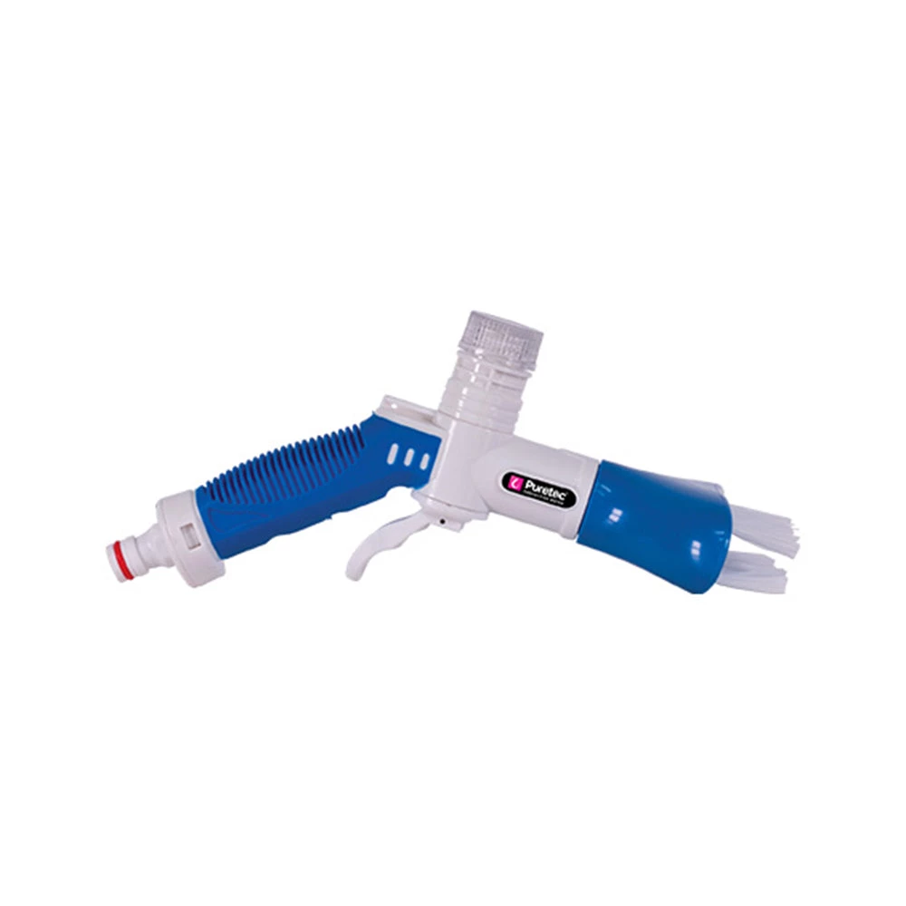 Puretec’s hand-held, trigger-activated filter cleaner makes cartridge cleaning quick and easy. This device greatly reduces the time and effort involved when cleaning your reusable Puretec water filters. The bristled brush reaches into pleated filters to physically loosen and dislodge sediment within your filter. With minimal splashback, the filter nozzle can be easily turned on and off using the easy-to-reach trigger. Fill the compartment provided with detergent for extra-effective cleaning.