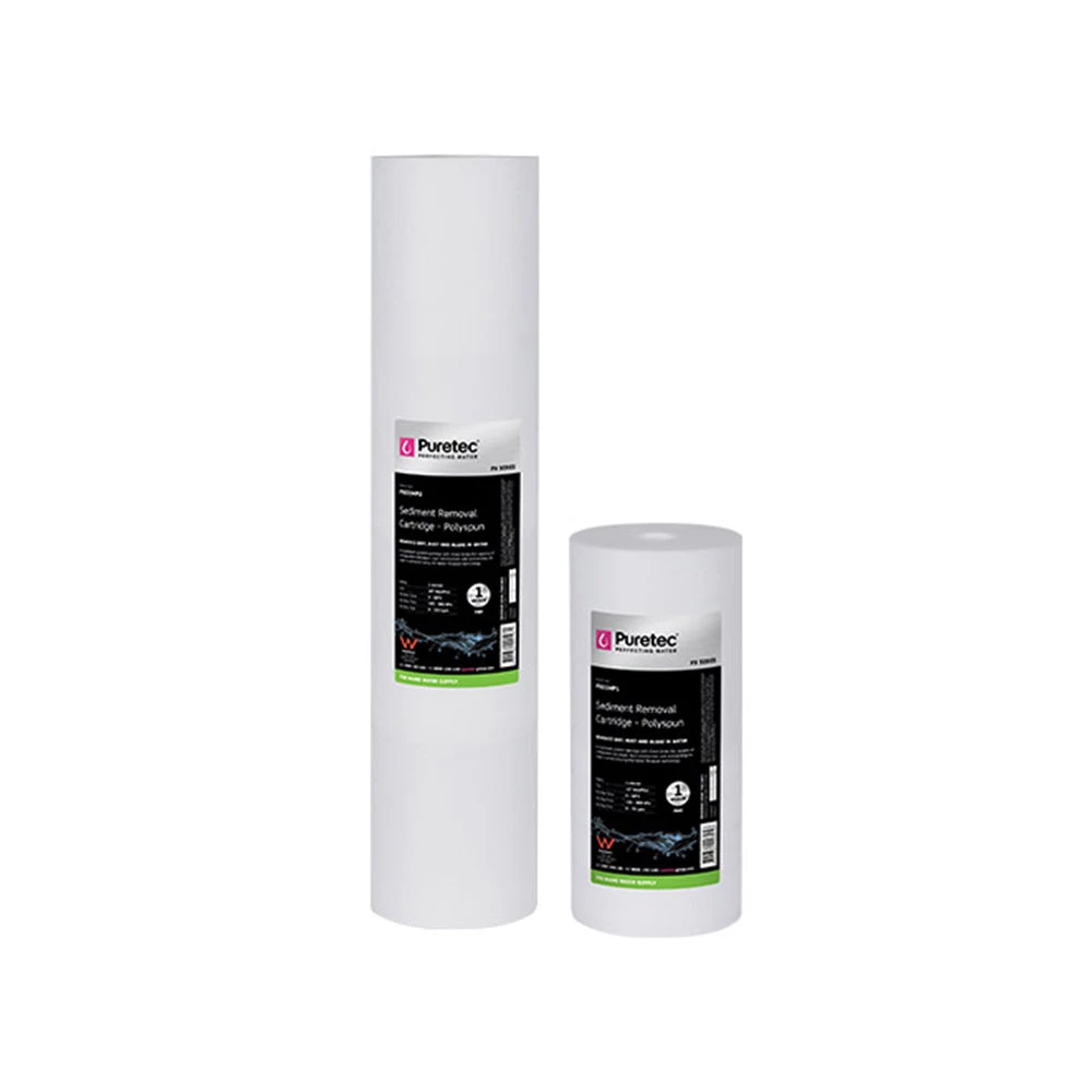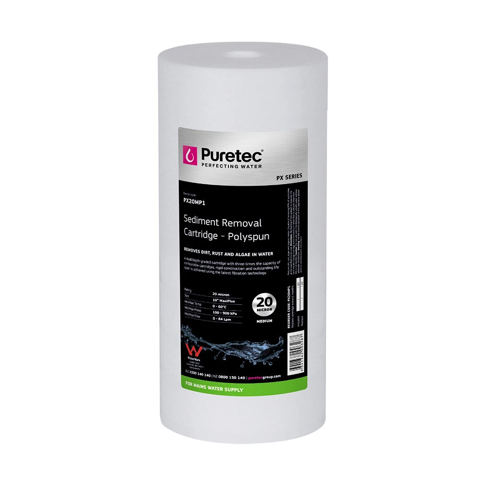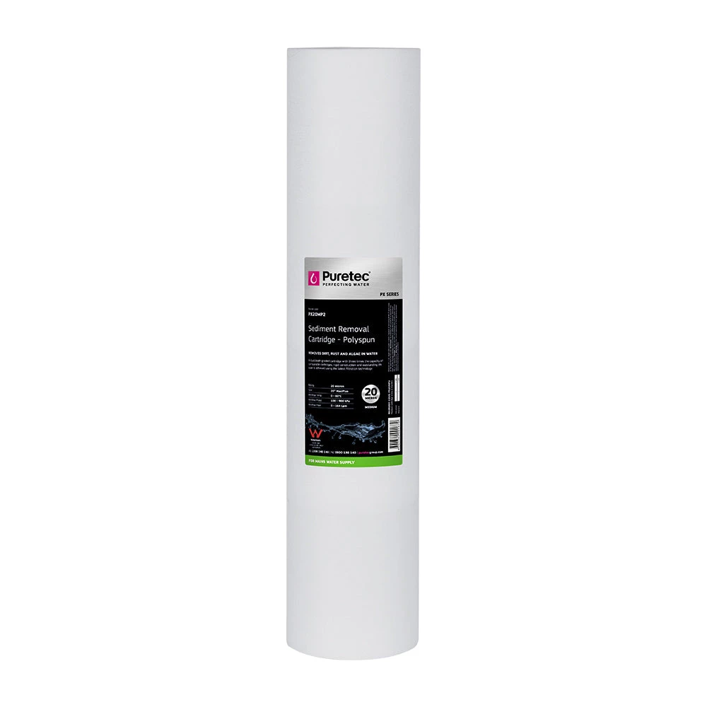 The economical Puretec PX Series cartridges are constructed from virgin polypropylene which is spun and melted simultaneously. This innovative technique means there is no centre core to restrict filter performance. Precise depth filtration is achieved through graded density construction.Â