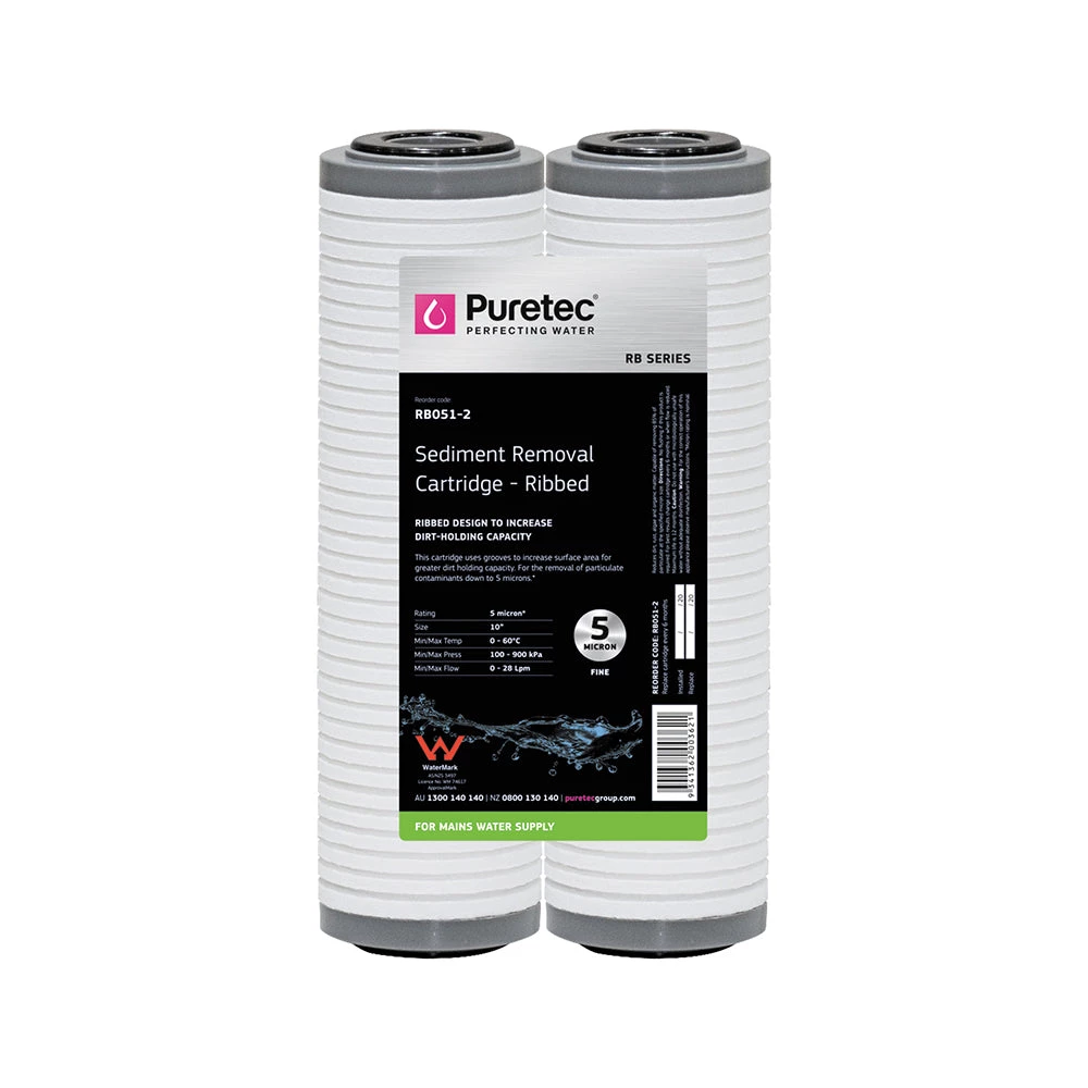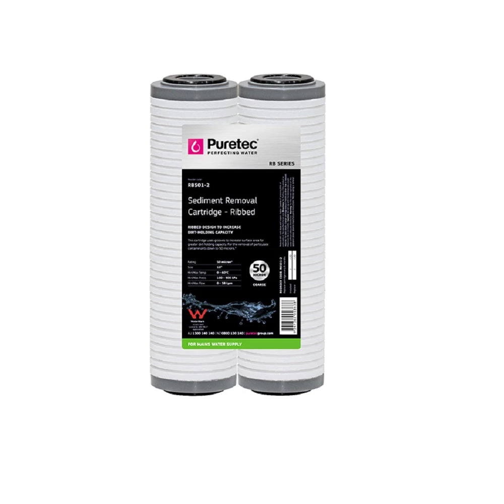 Puretec RB Ribbed Sediment Series cartridges uses grooves to increase surface area for greater dirt-holding capacity. These cartridges reduces dirt, rust, algae and organic matter.